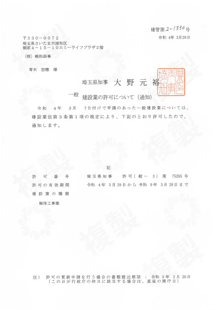 | 建設業(解体) | 埼玉県知事(般-3)第75295号 |