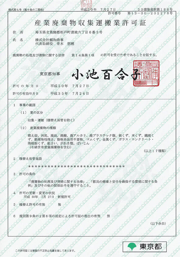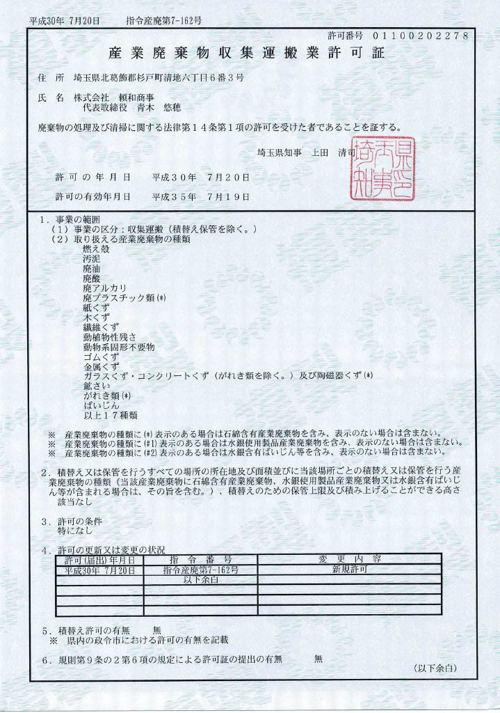 | 産業廃棄物収集運搬 | (埼玉・東京)第202278号 |